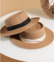 2024新款夏季遮阳法式平顶草帽女大头围礼帽海边沙滩防晒编织帽子