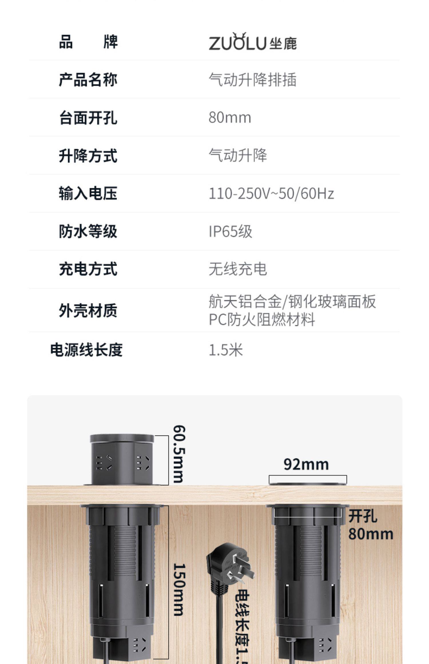 气动升降插座嵌入式桌面隐藏中岛台办公桌按压伸缩排插