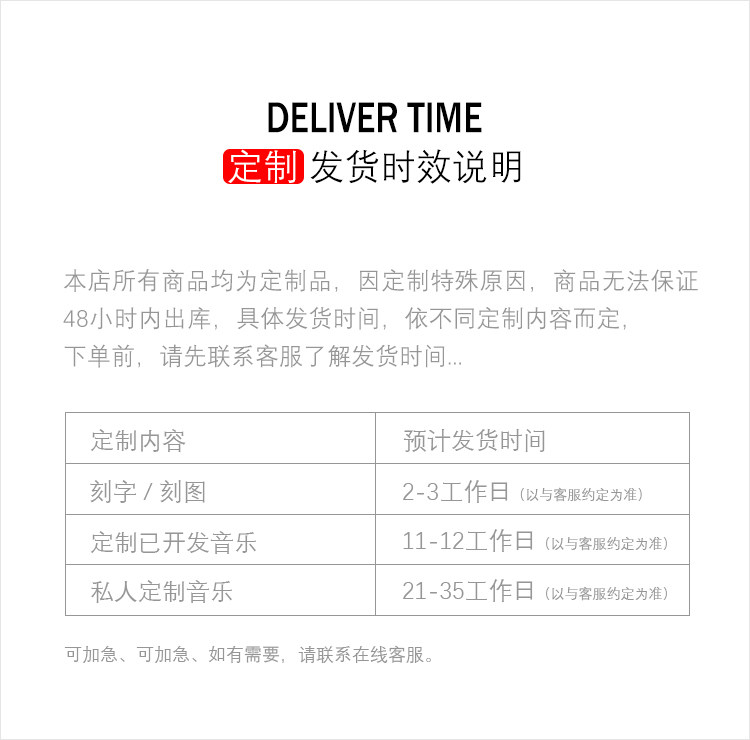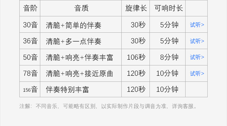 颜色分类:【遇见】 【windy hill】超好听 【一生所爱】大话西游 【梦中的婚礼】爱情 【生日快乐】 【夜空中最亮的星】 【告白气球】周杰伦 【夜的钢琴曲五】石进 【小幸运】田馥甄 【卡农】爱情 【我愿意】 【慢慢喜欢你】莫文蔚 【千与千寻】宫崎骏 【穿越时空的思念】超好听 【天空之城】宫崎骏 【妖精的旋律】 【曲库中的音乐】备注曲名 【定制音乐】包含定制费