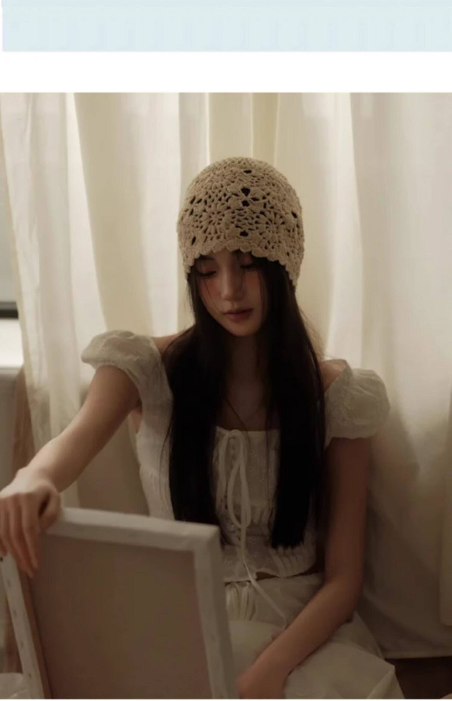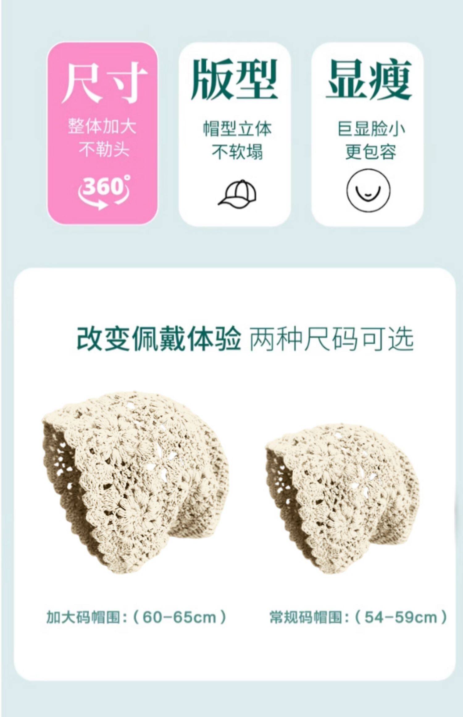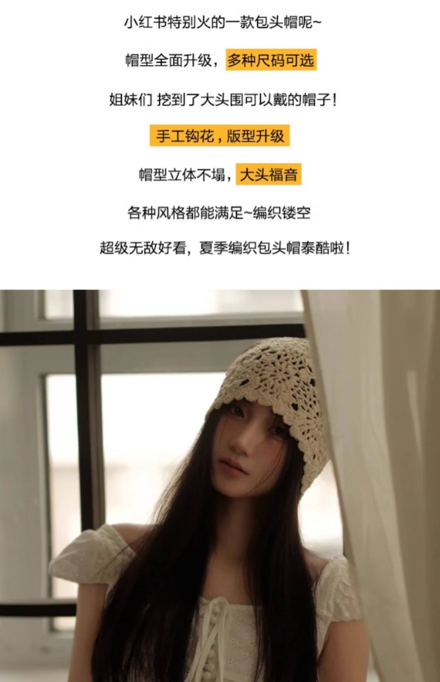 文艺风堆堆帽女2024新款大头围针织钩花包头帽薄款镂空百搭毛线帽